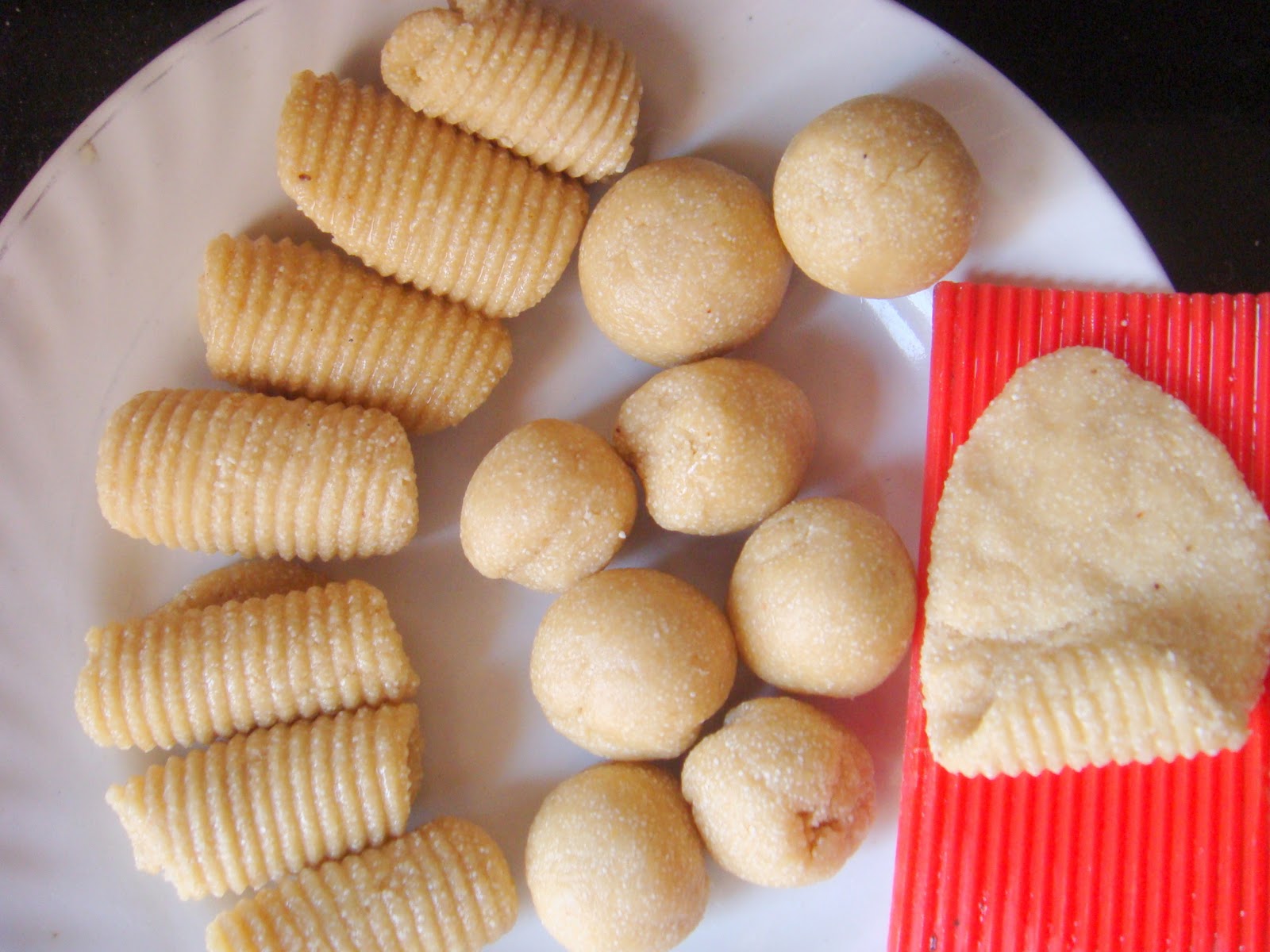Dry  fry the rava in a pan.  Take a big bowl and mix the rava, maida, wheat  flour, sugar, ghee, egg, essence & salt.  Take a little warm water  and add to these contents and make a dough.    If you have a food  processor you can make the dough in it.   Add the water little by little  or else it can become sticky because of the sugar.   Cover the dough  and keep aside for about 1 hour.   Take little by little dough &  make small balls, flatten it on the back of fork or on a  new comb and  roll it.  Apply a little oil on the fork or comb so that the dough does  not stick and rolls out evenly.